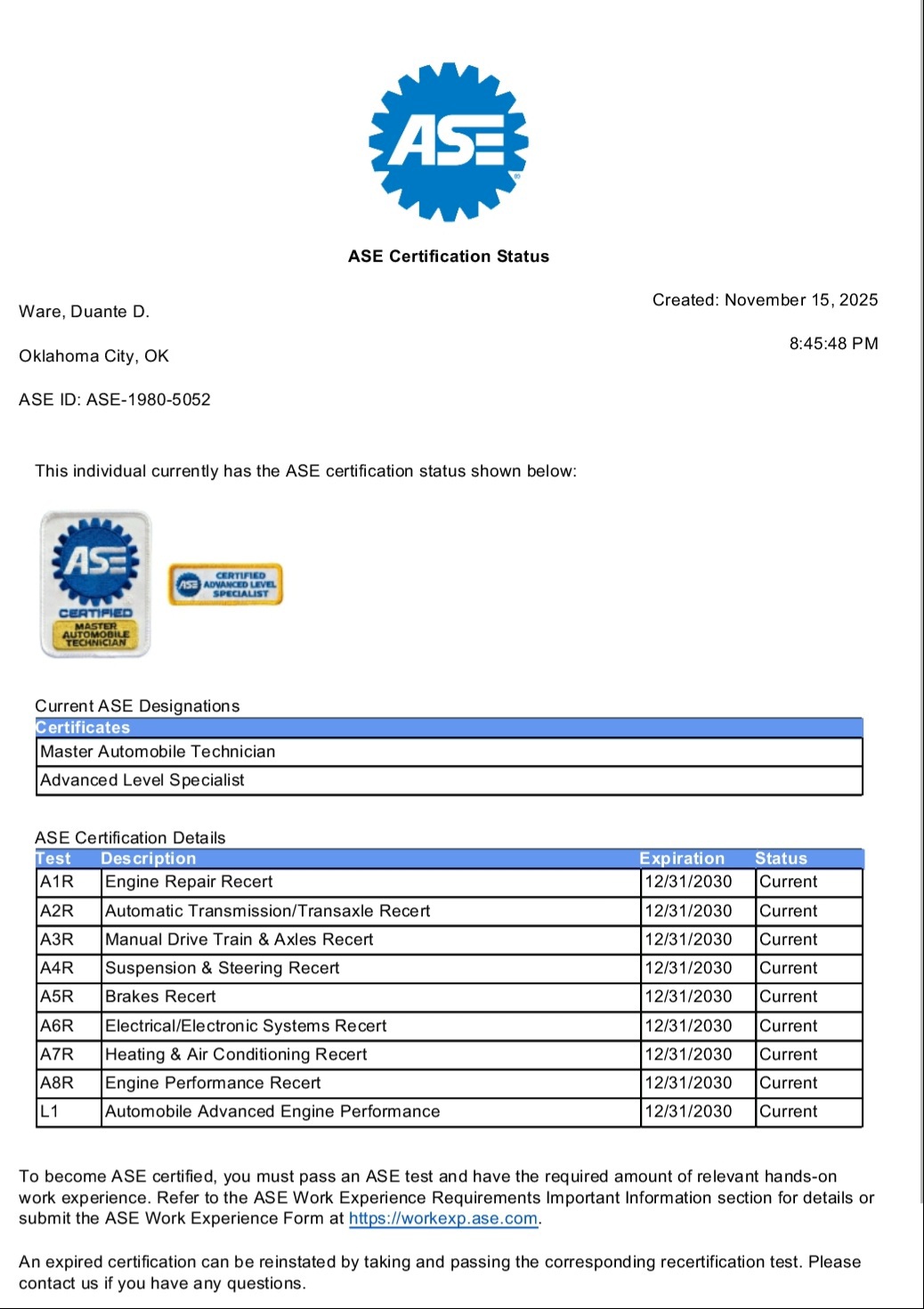I did a short stint as a Mechanic Contractor for Mercedes at their Manufacturing plant in Tuscaloosa, Alabama (2019) doing mainly electrical on new vehicles off the assembly line that had issues. I worked as a shop Lead Technician for a local independent shop here in OKC for a couple years and also as a forklift fleet mechanic here in OKC. As of November 2025 I have Certified as an L1 Advanced Engine Performance Technician (Diagnostics Specialist).
