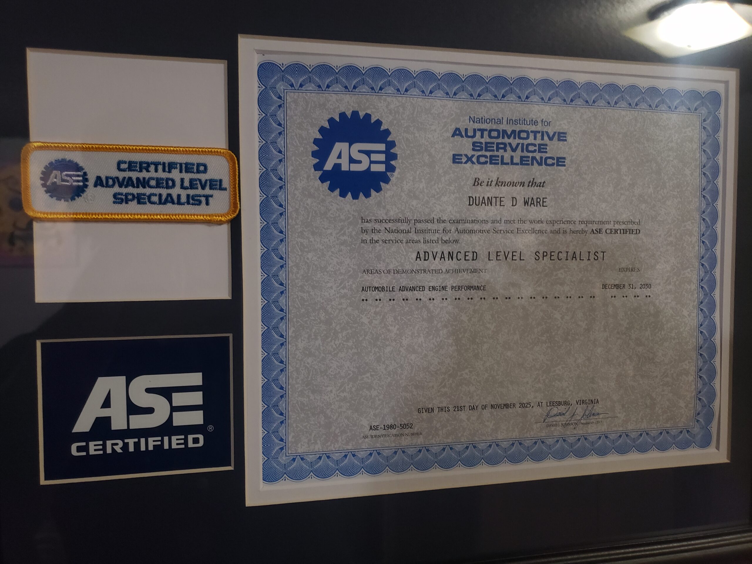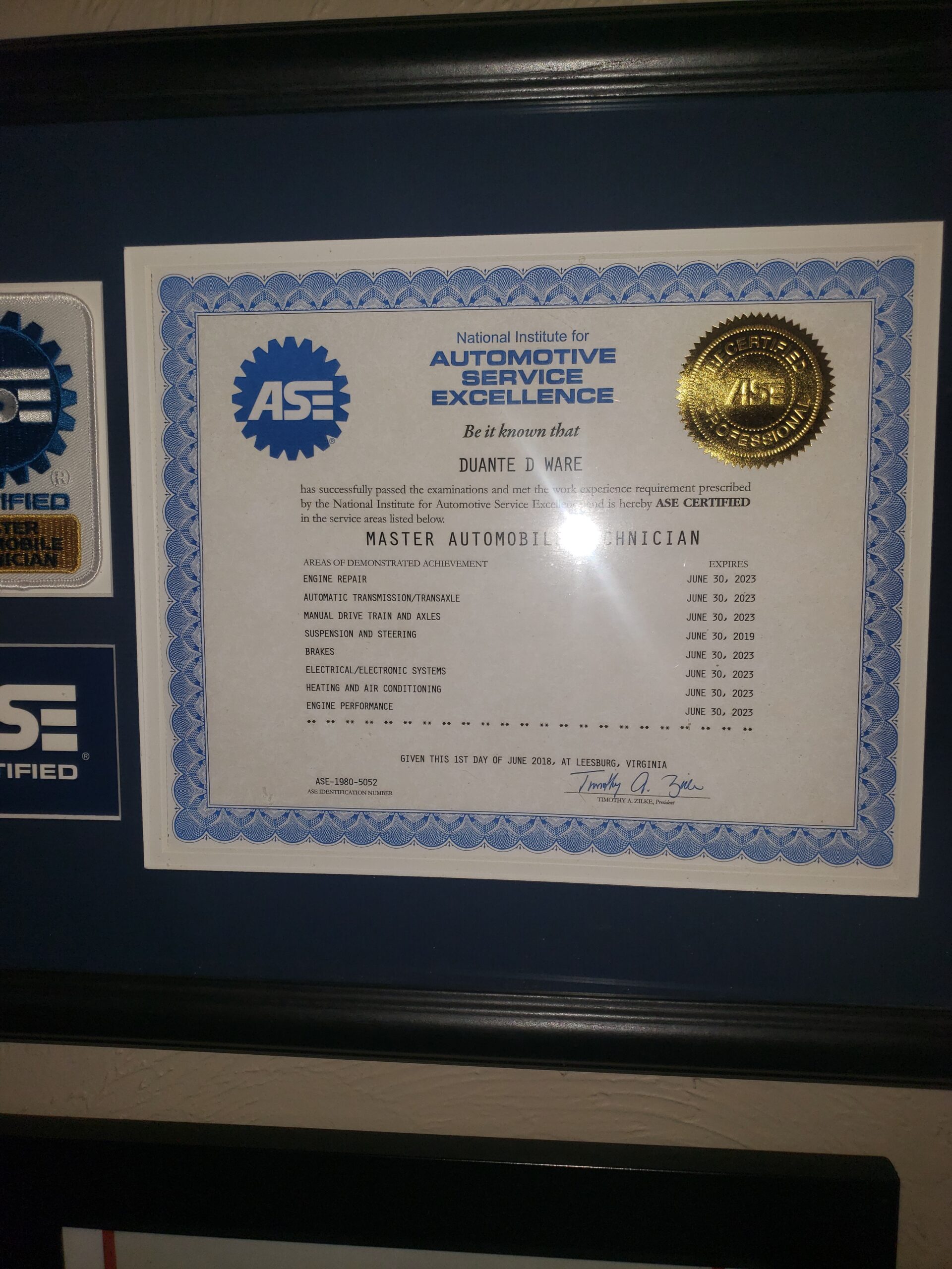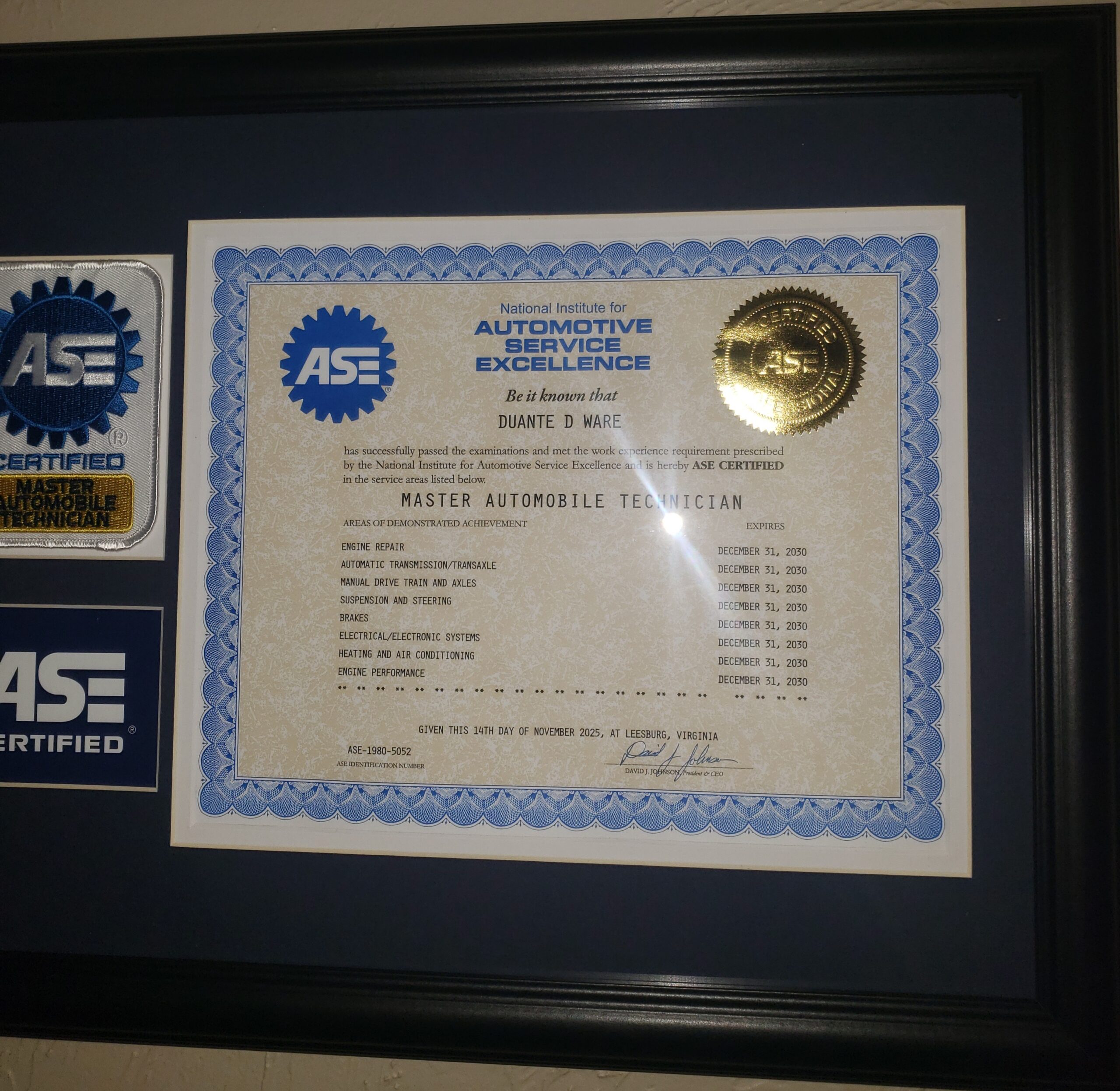 A couple of years later I happened to apply to a major company with great pay and benefits looking for experienced techs out of Oklahoma City. I applied and to my surprise I got the call. Next thing you know I was shipping my tool box through freight and jumping on a plane with my new wife and still small daughter. I worked as a fleet mechanic there for 5 years and while working there my son was born. The time spent at that company greatly increased my knowledge and experience on GM 5.3l, 6.0l, gas/CNG engines, Ford 7.3l, 6.0l diesels, Mercedes MB904 diesels, and Cummins 5.9l diesel/CNG engines. In 2018 I finally passed A.S.E. Tests A1-A8 and reached Master Automotive Technician Status.